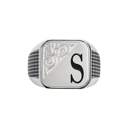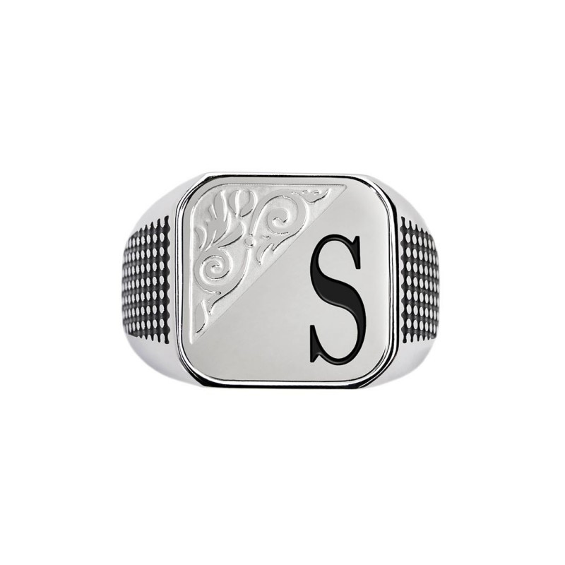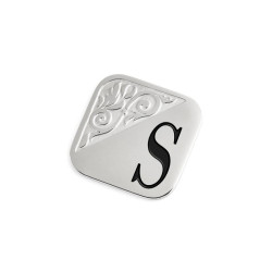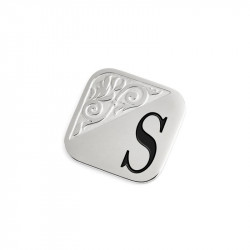 Descrizione: Piastrina quadrata per anello, sulla parte frontale un'incisione con texture e lettere in black oil. Sul retro logo Marlù inciso. Materiale: acciaio