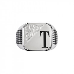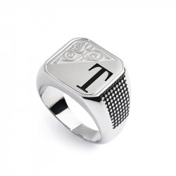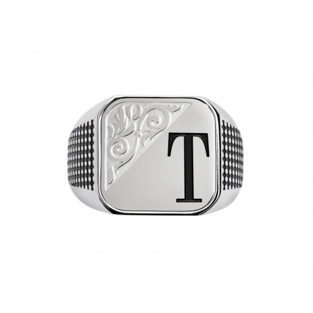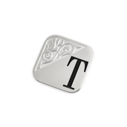 Descrizione: Piastrina quadrata per anello, sulla parte frontale un'incisione con texture e lettere in black oil. Sul retro logo Marlù inciso. Materiale: acciaio