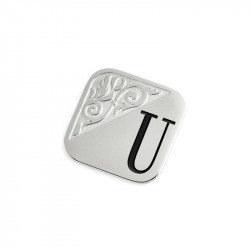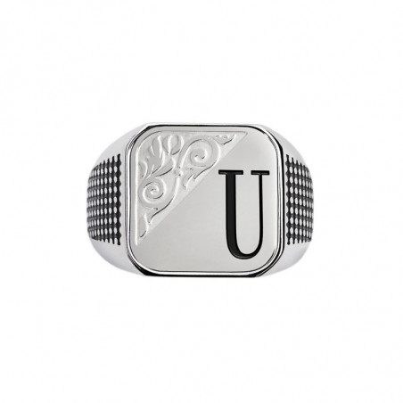 Descrizione: Piastrina quadrata per anello, sulla parte frontale un'incisione con texture e lettere in black oil. Sul retro logo Marlù inciso. Materiale: acciaio
