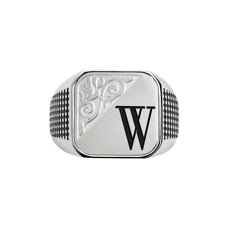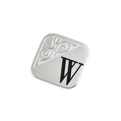 Descrizione: Piastrina quadrata per anello, sulla parte frontale un'incisione con texture e lettere in black oil. Sul retro logo Marlù inciso. Materiale: acciaio