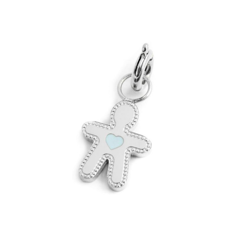 Descrizione: Charm a forma di bimbo, nella parte anteriore si trova un cuore in smalto azzurro. Sul retro è laserata la scritta "Nel mio", un cuore e il logo Marlù. Materiale: acciaio.