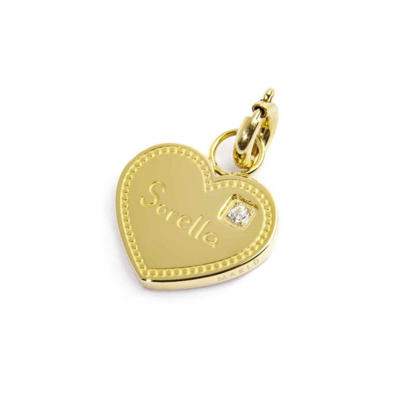 Descrizione: Charm a forma di cuore con misura 1*1,2 cm, con al centro incisa la scritta "Sorella" e cubic zirconia. Sul retro incisa la scritta "Per dirti che sei nel mio" con un cuoricino con smalto rosso. Logo Marlù laserato sul bordo. Materiale: acciaio.