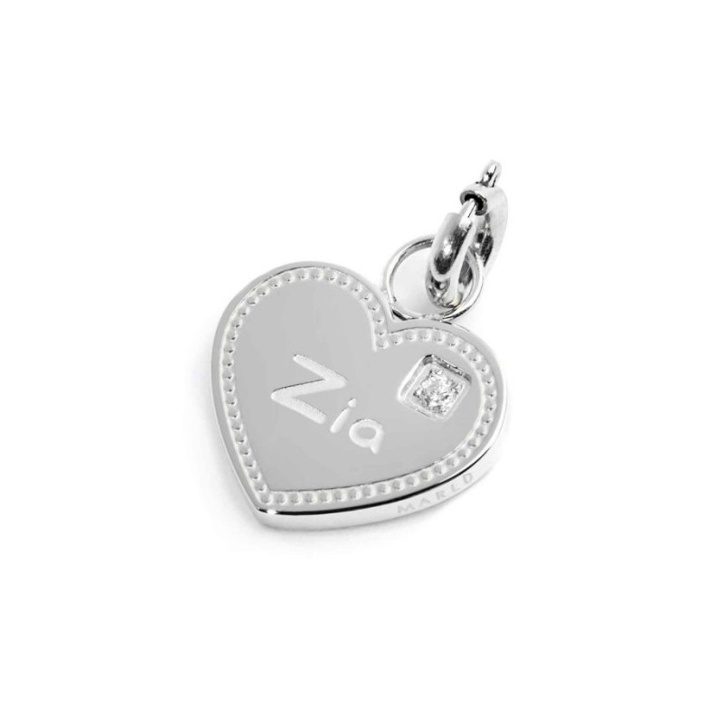 Descrizione: Charm a forma di cuore con misura 1*1,2 cm, con al centro incisa la scritta "Zia" e cubic zirconia. Sul retro incisa la scritta "Per dirti che sei nel mio" con un cuoricino con smalto rosso. Logo Marlù laserato sul bordo. Materiale: acciaio.