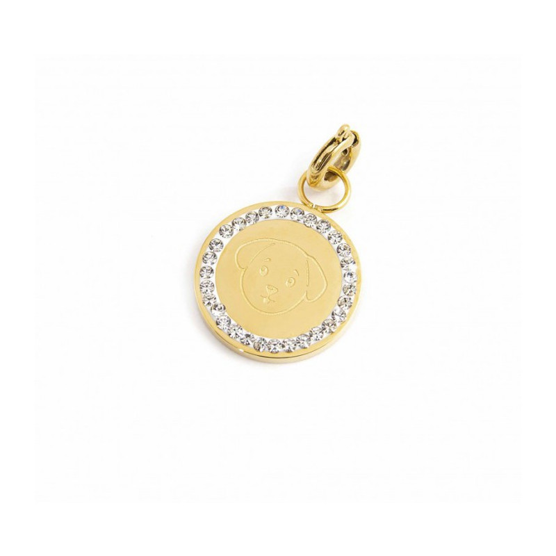 Descrizione: Charm tondo a medaglietta con diametro 1,2 cm, con nel centro inciso un cane e sul bordo cristalli bianchi. Sul retro incise la scritta "famiglia è amore" e il logo Marlù. Materiale: acciaio.