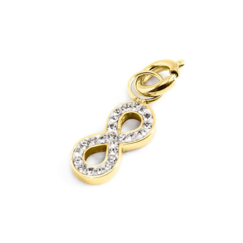 Descrizione: Charm a forma di infinito. Sul fronte l'infinito ha cristalli, sul retro è presente il logo MARLU' laserato. Materiale: acciaio.