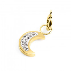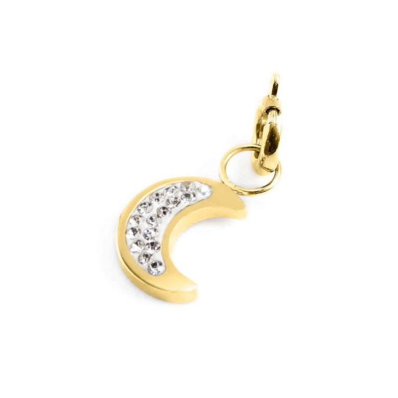 Descrizione: Charm a forma di luna. Sul fronte la luna ha cristalli, sul retro è presente il logo MARLU' laserato. Materiale: acciaio.