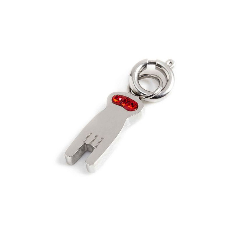 Descrizione: Charm a forma di mano-corna. Sul fronte la mano ha cristalli, sul retro è presente il logo MARLU' laserato. Materiale: acciaio.