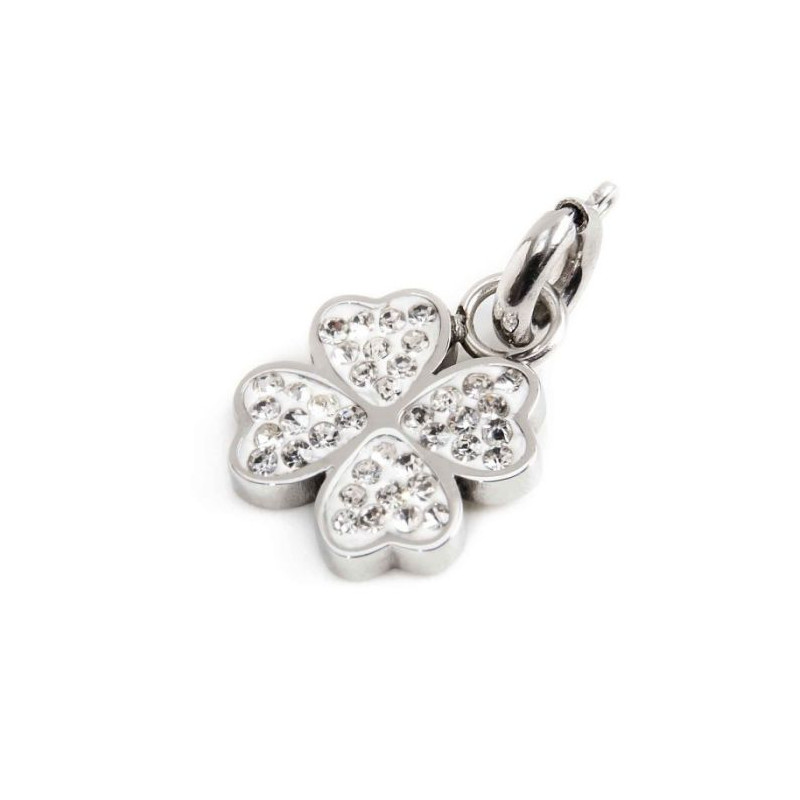 Descrizione: Charm a forma di quadrifoglio. Sul fronte il quadrifoglio ha cristalli, sul retro è presente il logo MARLU' laserato. Materiale: acciaio.