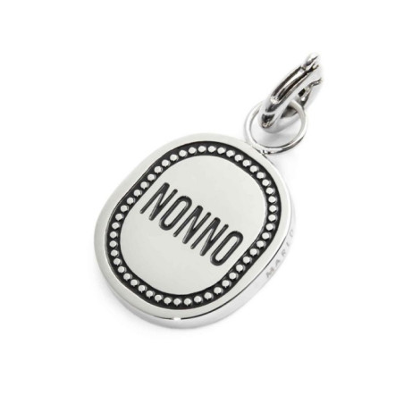 Descrizione: Charm in acciaio ovale a medaglietta con misura 1,2*1 cm, con al centro incisa in black oil la scritta "NONNO". Sul retro scritte incise. Logo Marlù laserato sul bordo. Materiali: acciaio, black oil