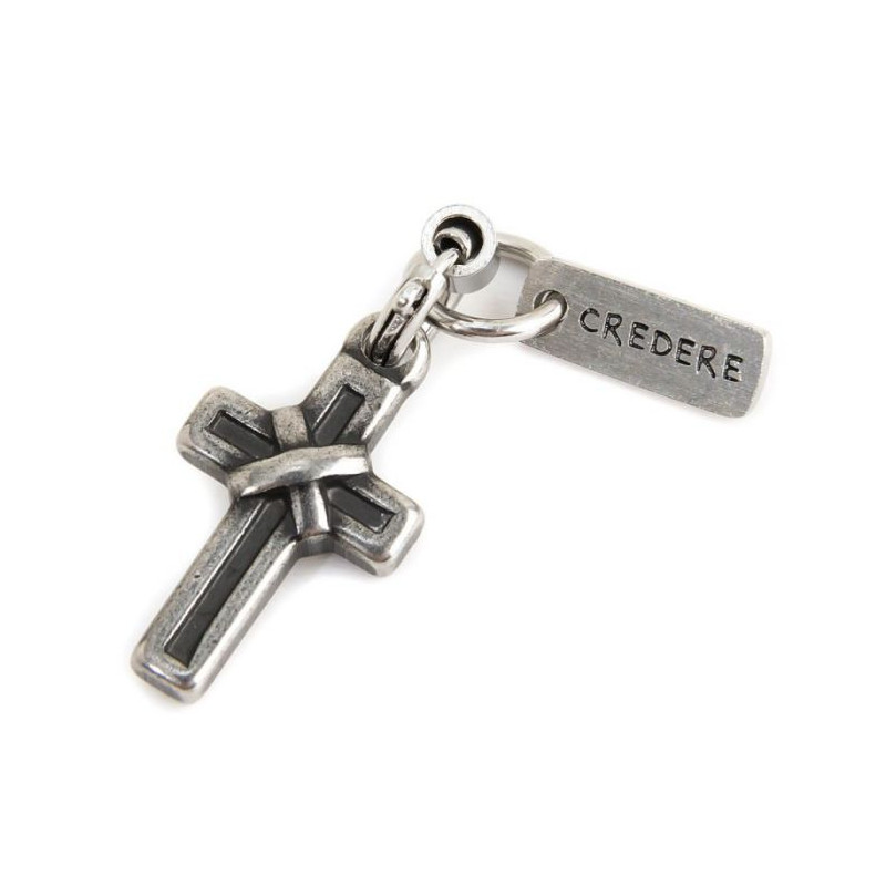 Descrizione: Charm a forma di croce e tag rettangolare con scritta "Credere". Materiale : acciaio brunito