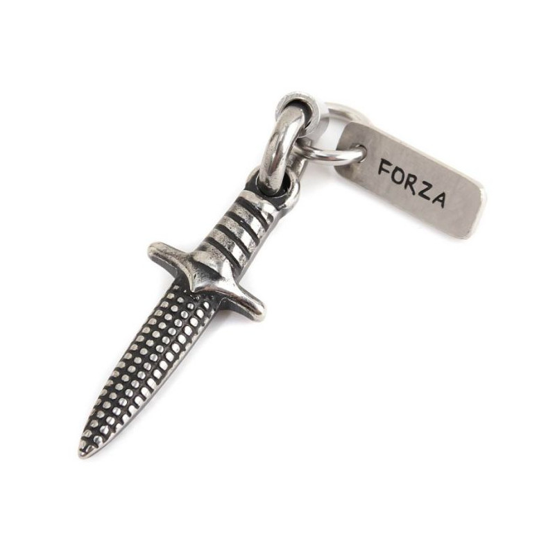 Descrizione: Charm a forma spada bugnata e tag rettangolare con scritta "Forza". Materiale : acciaio brunito