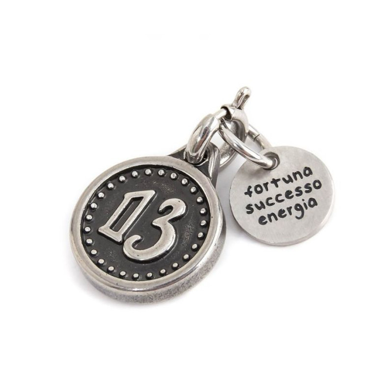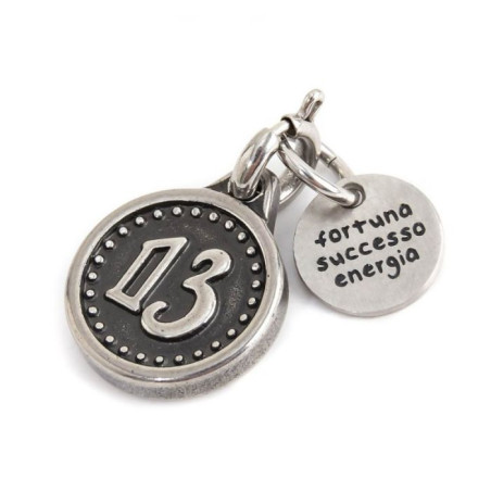 Descrizione: Charm 13 e tag rettangolare con scritta "Famiglia". Materiale : acciaio brunito