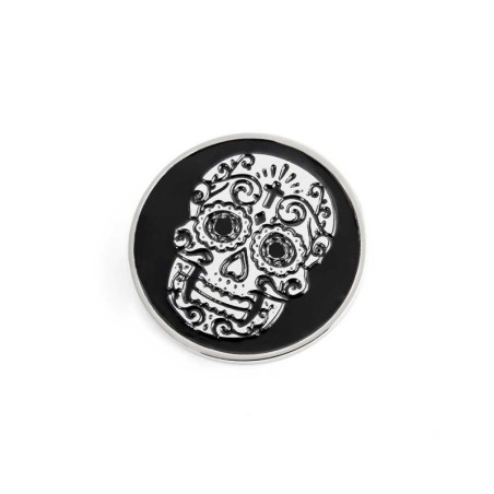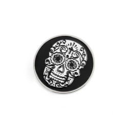 Descrizione: Piastrina tonda in acciaio per anello, con al centro un teschio messicano in black oil. Sul retro logo Marlù inciso. Materiali: acciaio, black oil