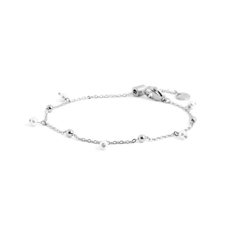 Descrizione: Bracciale con catena con sfere in acciaio alternate a perle pendenti con diametro 3.30 mm. Lunghezza totale 19 cm regolabile da 19 cm a 14 cm tramite cursore. Marlù logo tag presente all'estremità.