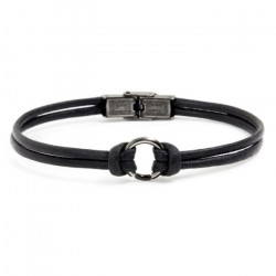 Descrizione: Bracciale in corda cerata doppio filo con elemento circolare pinzato al centro di 14 mm. Lunghezza 21 cm regolabile. Materiale: cordino cerato e acciaio.
