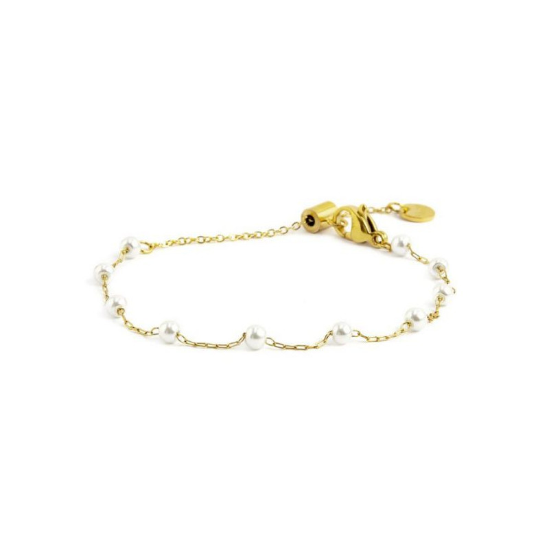 Descrizione: Bracciale in acciaio catena con perle bianche con diametro 3.30 mm. Lunghezza totale 19 cm regolabile tramite cursore da 19 cm a 15 cm. Marlù logo tag presente all'estremità.