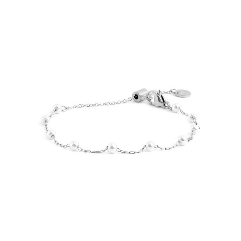 Descrizione: Bracciale in acciaio catena con perle bianche con diametro 3.30 mm. Lunghezza totale 19 cm regolabile tramite cursore da 19 cm a 15 cm. Marlù logo tag presente all'estremità.