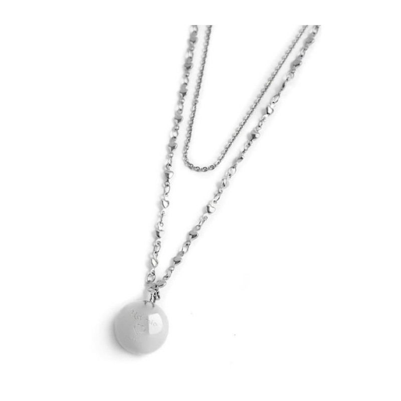 Descrizione: collana in acciaio chiama angeli con doppia catena. La prima catena, a cuori, è più lunga, con pendente a sfera, contenente un campanello chiama angeli. Sul lato anteriore della sfera è laserato la scritta "il dono più prezioso sei tu" sul retro sono laserate: la scritta "Nel mio", un cuore e il logo Marlù. La seconda catena è interna ed è più sottile a cui si possono agganciare i charm. La lunghezza totale è di 100 cm.