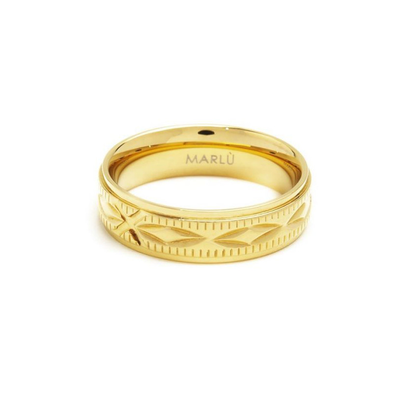Descrizione: Anello in acciaio con texture a nodo incisa. Logo Marlù e taglia laserati all'interno.