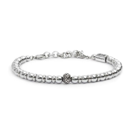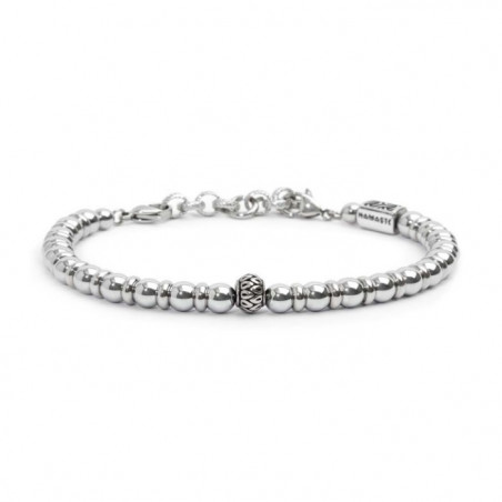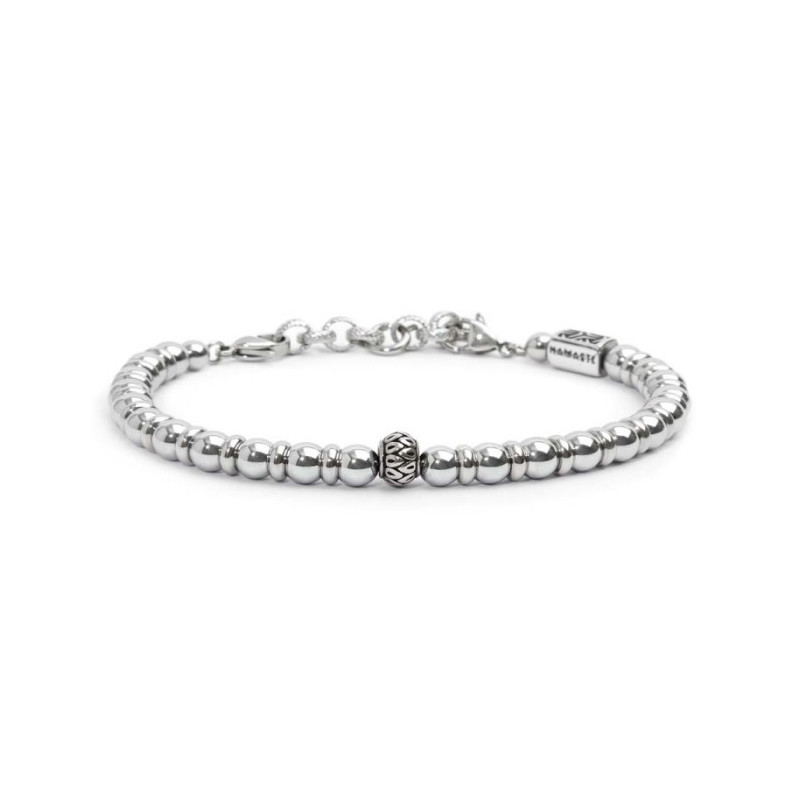 Descrizione: Bracciale in acciaio con sfere di ematite alternate a dischetti di acciaio, elemento centrale a forma cilindrica in acciaio con trama con black oil. Ad una estremità elemento rettangolare in acciaio con trama con black oil, sul fronte il logo Marlù, su retro la parola Namastè. Chiusura con moschettone su entrambi i lati. Estensione con catena rolò con trama, removibile e/o regolabile tramite moschettone tondo al centro.
