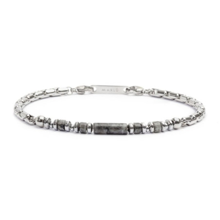 Descrizione: Bracciale in acciaio con catena box con centrale cilindrico in pietra ai cui lati sono alternati elementi di acciaio, ematite e pietre. Lunghezza totale 21 cm, regolabile da 21 a 19 cm tramite logo tag Marlù in acciaio removibile.