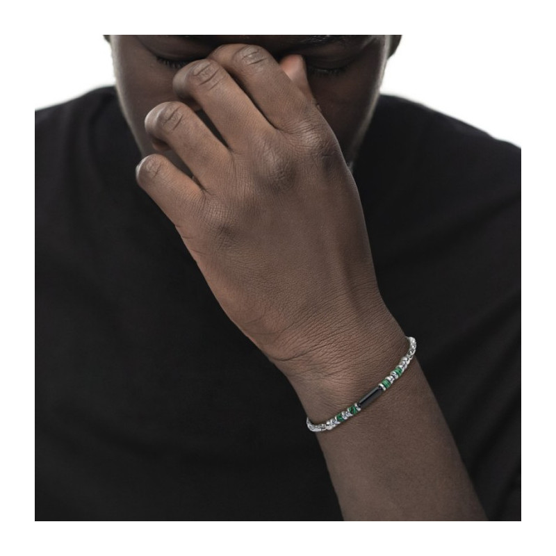 Descrizione: Bracciale in acciaio con catena box con centrale cilindrico in pietra ai cui lati sono alternati elementi di acciaio, ematite e pietre. Lunghezza totale 21 cm, regolabile da 21 a 19 cm tramite logo tag Marlù in acciaio removibile.