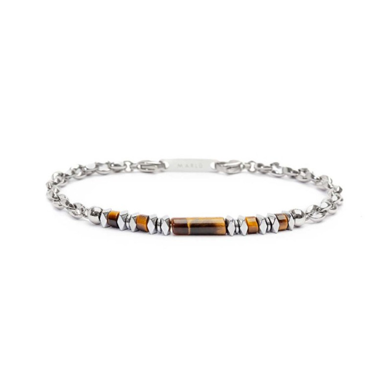 Descrizione: Bracciale in acciaio con catena marine con centrale cilindrico in pietra ai cui lati sono alternati elementi di acciaio, ematite e pietre. Lunghezza totale 21 cm, regolabile da 21 a 19 cm tramite logo tag Marlù in acciaio removibile.