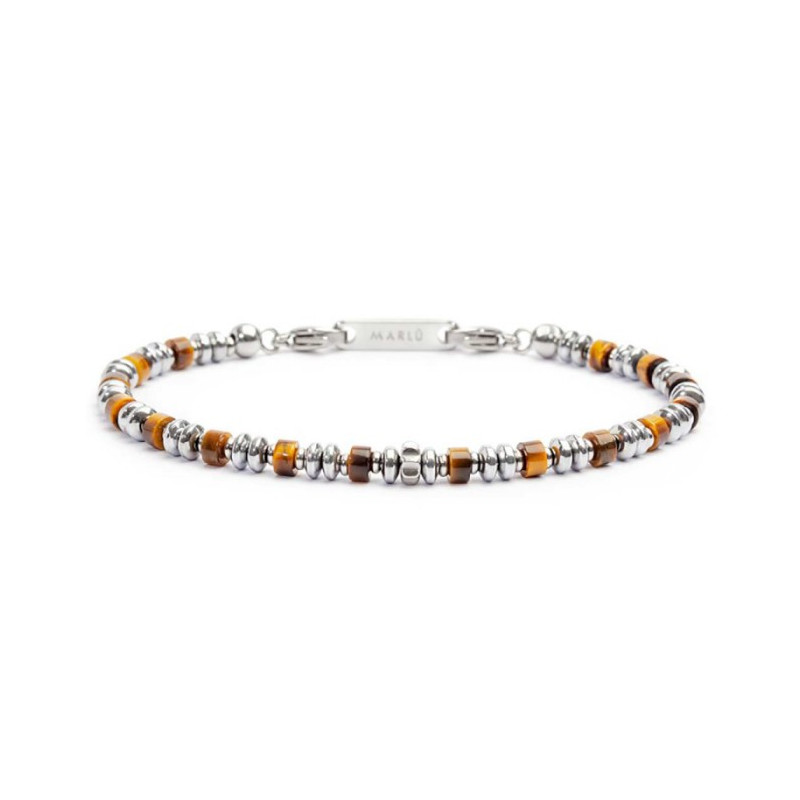 Descrizione: Bracciale in acciaio con rondelle in pietra alternati ad elementi in ematite ed acciaio. Al centro una rondella diamantata. Lunghezza totale 21 cm, regolabile da 21 a 19 cm tramite logo tag Marlù in acciaio removibile.