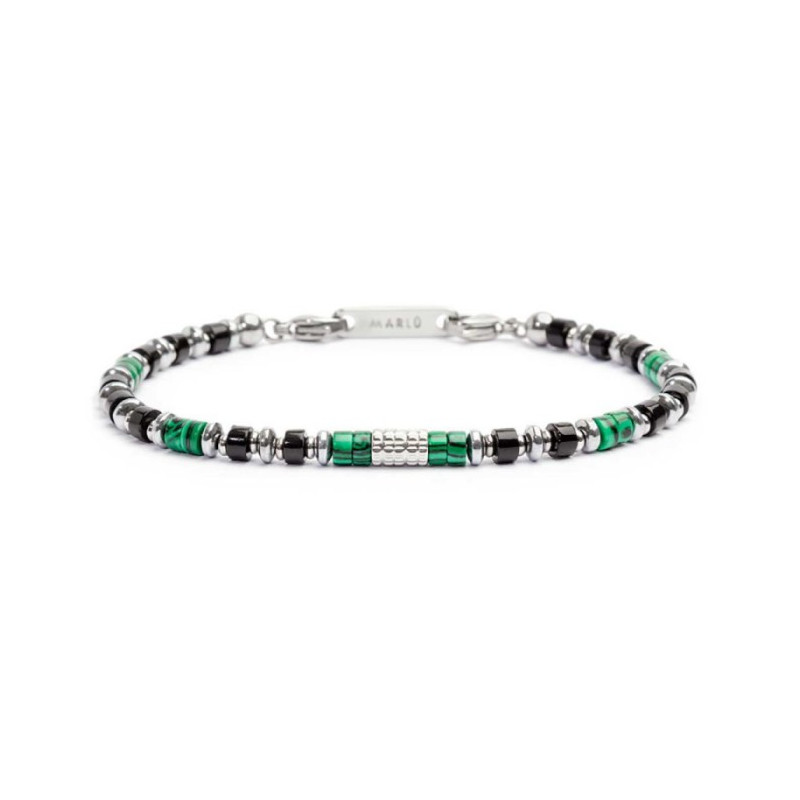 Descrizione: Bracciale in acciaio con rondelle in malachite ed onice nera alternati ad elementi in ematite ed acciaio. Al centro un cilindro diamantato. Lunghezza totale 21 cm, regolabile da 21 a 19 cm tramite logo tag Marlù in acciaio removibile.