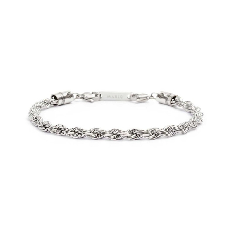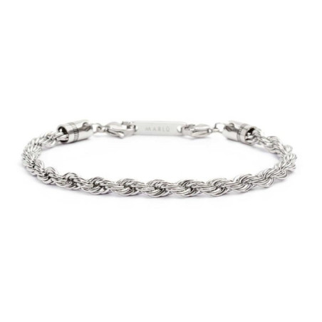 Descrizione: Bracciale in acciaio con catena corda con spessore 5 mm con elemento finale lavorato. Lunghezza totale 21 cm, regolabile da 21 a 19 cm tramite logo tag Marlù in acciaio removibile.