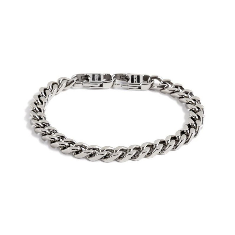 Descrizione: Bracciale con catena grumetta piatta, grandezza maglia 8 mm, con doppio moschettone con texture bugnata e logo Marlù inciso. Lunghezza bracciale regolabile 22 cm.