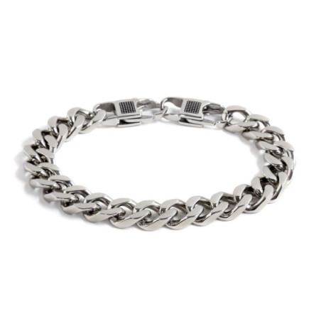 Descrizione: Bracciale con catena grumetta piatta, grandezza maglia 10 mm, con doppio moschettone con texture bugnata e logo Marlù inciso. Lunghezza bracciale regolabile 22 cm.