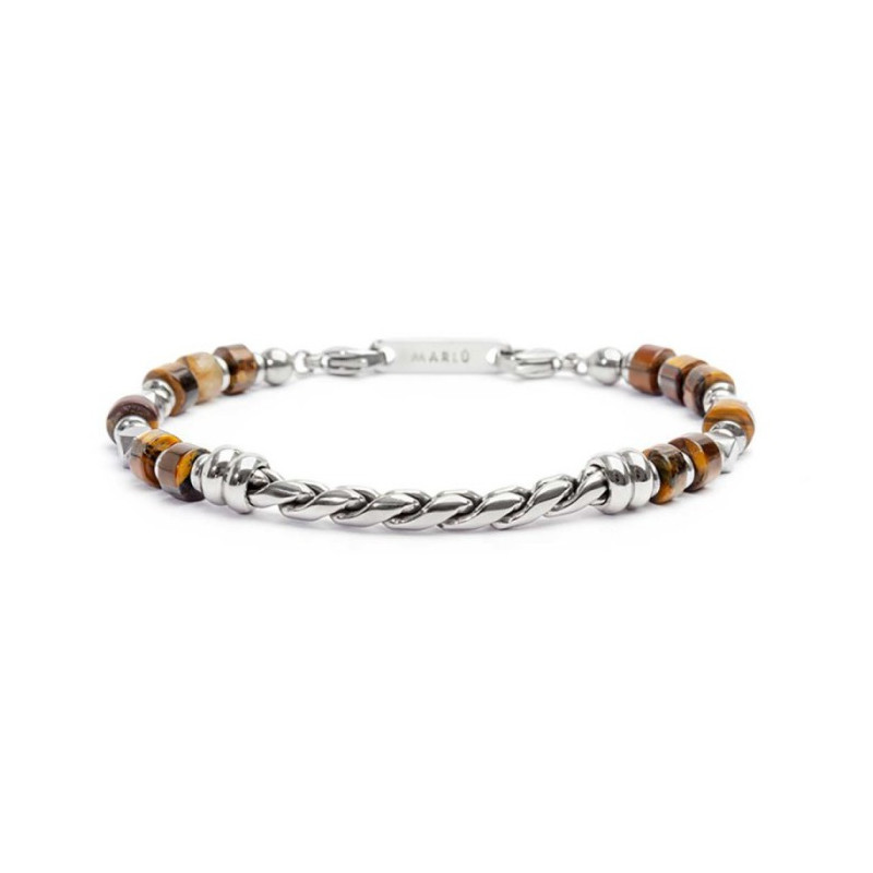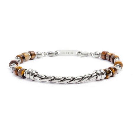 Descrizione: Bracciale in acciaio con rondelle in occhio di tigre alternate ad elementi in ematite ed acciaio. Al centro un elemento rigido con catena twisted serpentine. Lunghezza totale 21,5 cm, regolabile da 21,5 a 19,7 cm tramite logo tag Marlù in acciaio removibile.