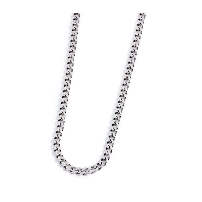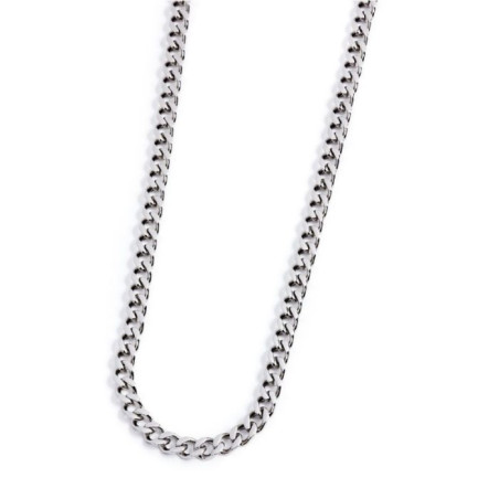 Descrizione: Catena maglia grumetta piatta grandezza maglia 6 mm con doppio moschettone con texture bugnata e logo Marlù inciso. Lunghezza collana 50 cm regolabile tramite secondo moschettone Marlù removibile,
