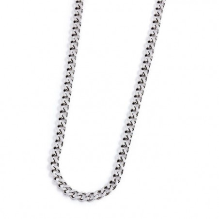 Descrizione: Catena maglia grumetta piatta grandezza maglia 6 mm con doppio moschettone con texture bugnata e logo Marlù inciso. Lunghezza collana 50 cm regolabile tramite secondo moschettone Marlù removibile,