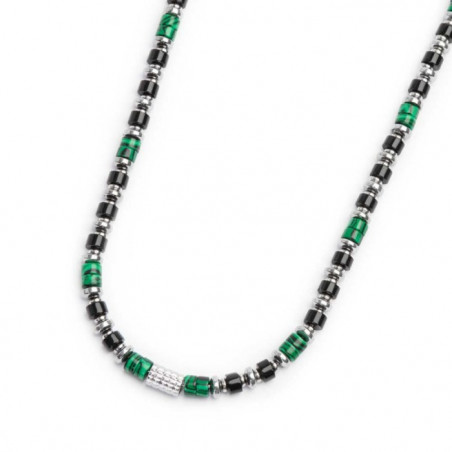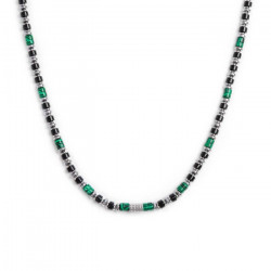 Descrizione: Collana in acciaio con rondelle in malachite ed onice nera alternati ad elementi in ematite ed acciaio. Al centro un cilindro diamantato. Lunghezza totale 52 cm, regolabile da 52 a 50 cm tramite logo tag Marlù in acciaio removibile.