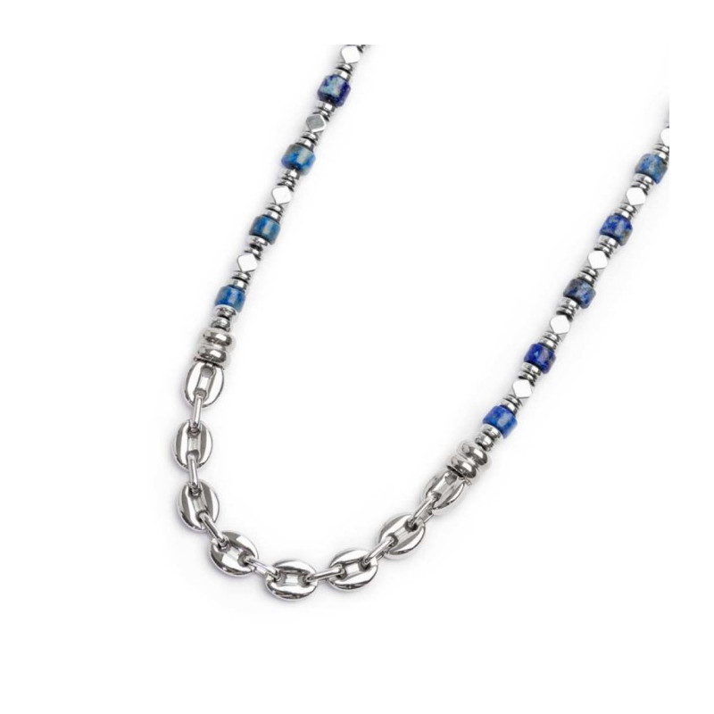 Descrizione: Collana in acciaio con rondelle in sodalite alternati ad elementi in ematite ed acciaio. Al centro catena marine. Lunghezza totale 54 cm, regolabile da 54 a 52 cm tramite logo tag Marlù in acciaio removibile.