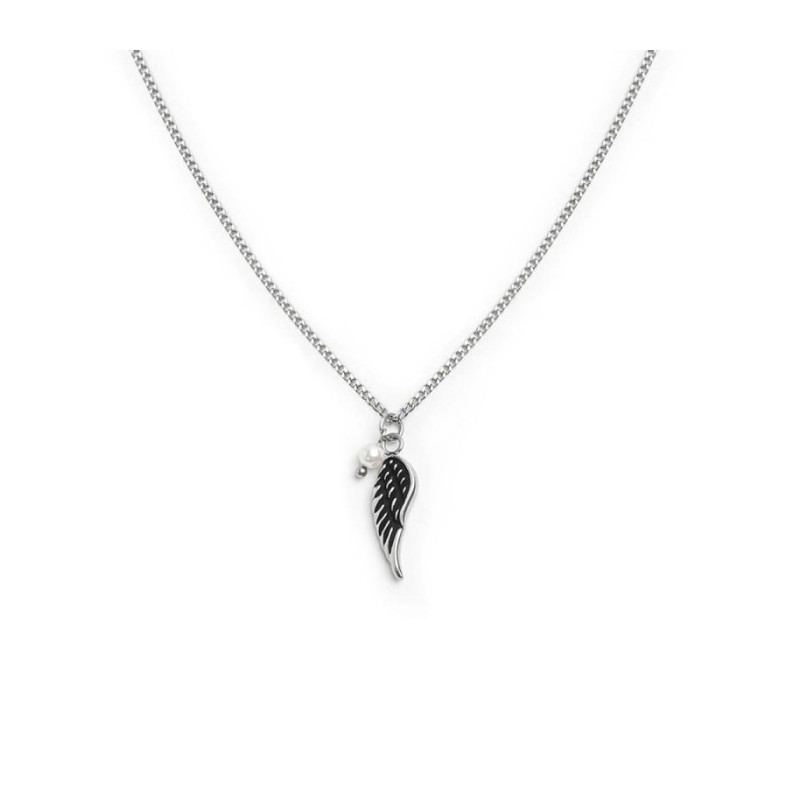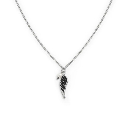 Descrizione: Collana in acciaio con catena a grumetta, con ala in acciaio con black oil e piccola perla pendenti. Lunghezza totale 70 cm, regolabile a 60 cm, a 65 cm, a 70 cm.