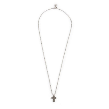 Descrizione: Collana in acciaio con catena box, con croce pendente con superfice frontale in canna di fucile e cristalli neri e sul retro incisione a trama. Lunghezza totale 50 cm, regolabile da 50 a 45 cm.