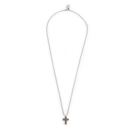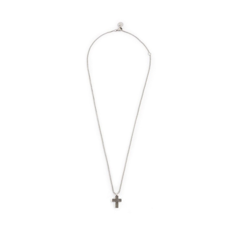 Descrizione: Collana in acciaio con catena box, con croce pendente con superfice frontale in canna di fucile e cristalli neri e sul retro incisione a trama. Lunghezza totale 50 cm, regolabile da 50 a 45 cm.