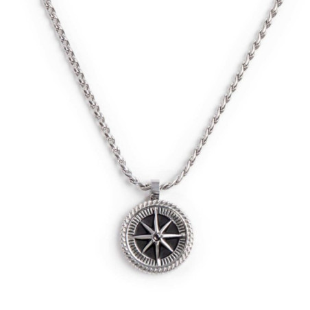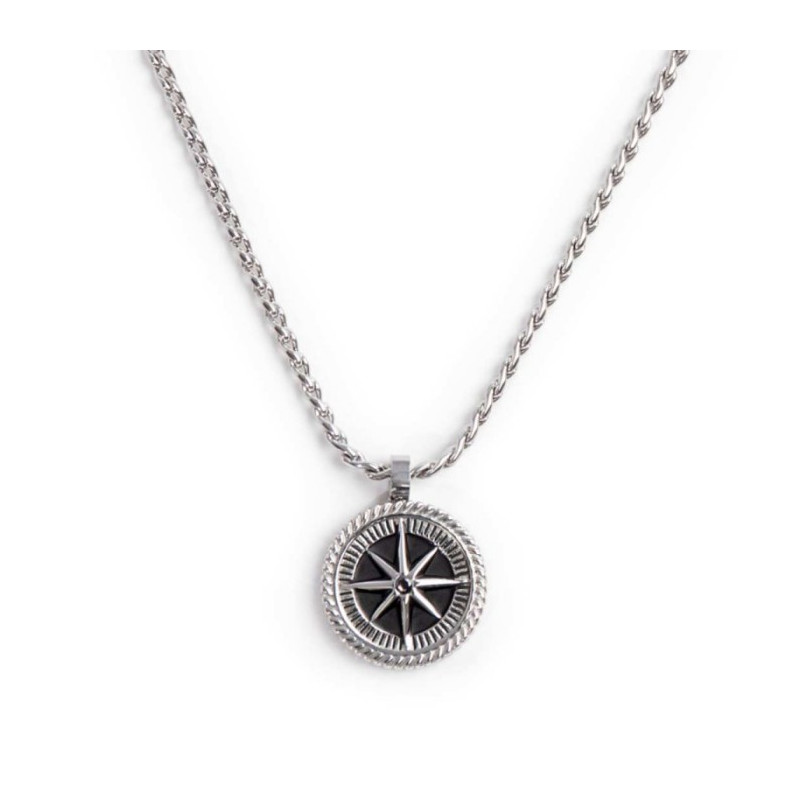 Descrizione: Collana in acciaio con catena twisted serpentine con pendente tondo con rosa dei venti con black oil, al centro un cristallo nero. Sul retro del pendente incisa la scritta "FOLLOW YOUR STAR", una rosa dei venti e il logo Marlù. Lunghezza totale 50 cm, regolabile da 50 a 48 cm tramite logo tag Marlù in acciaio removibile.