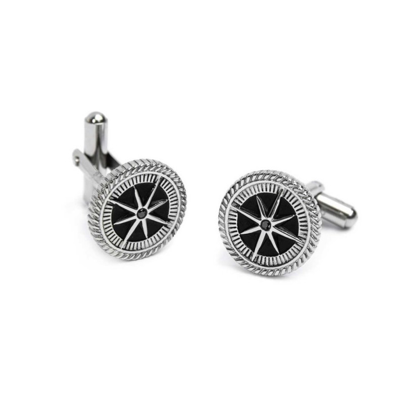 Descrizione: Gemelli a coppia in acciaio tondi con rosa dei venti con black oil e al centro un cristallo nero. Logo Marlù presente sulla parte inferiore.