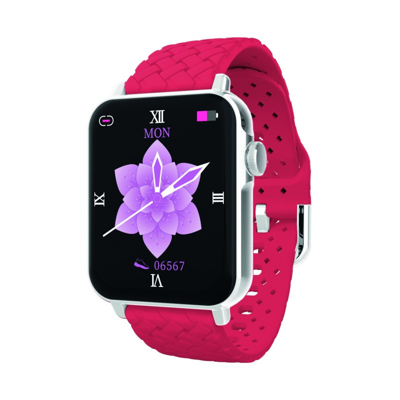 Descrizione: orologio smartwatch movimento digitale, cassa in lega di metallo e cinturino in silicone rosso intrecciato - display completamente touch 1,69" - tempo di ricarica 2 ore circa - tempo di utilizzo 7 giorni circa. Dimensione cassa: 40,5 x 34 mm. Funzioni: notifica chiamate e messaggi, timer, sveglia, cambio sfondo schermo, cronografo, accensione schermo con rotazione del polso, calcolatrice, controllo musica, telecomando foto selfie e blocco schermo. Vetro minerale. Impermeabilità ip68