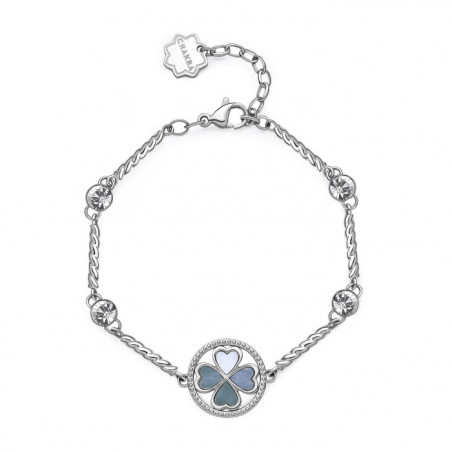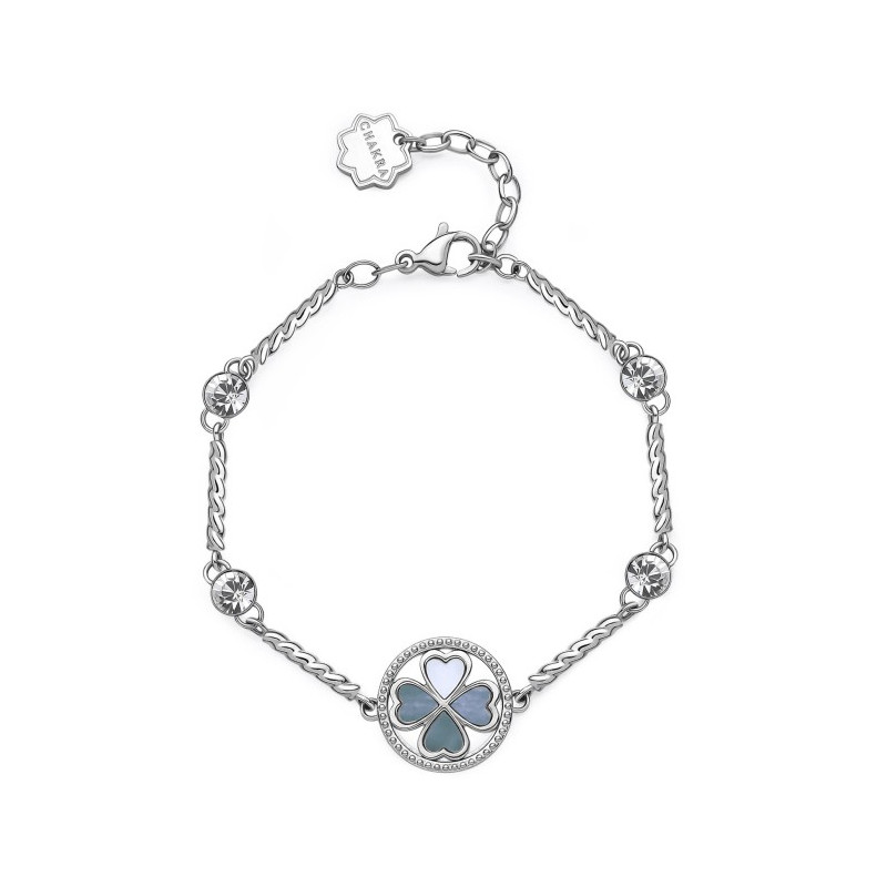 Descrizione: bracciale a settori in acciaio anallergico - madreperla - simbolo quadrifoglio - chiusura a moschettone - misura regolabile da 16 a 18 cm