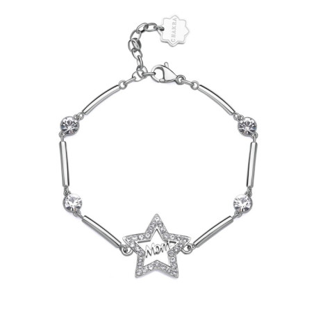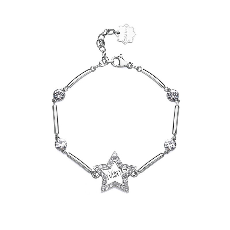 Descrizione: bracciale settori acciaio anallergico - cristalli bianchi - simbolo stella scritta mamma - chiusura a moschettone - misura regolabile da 16 a 18 cm