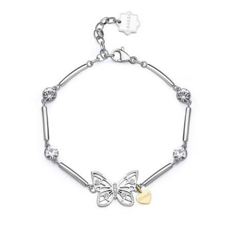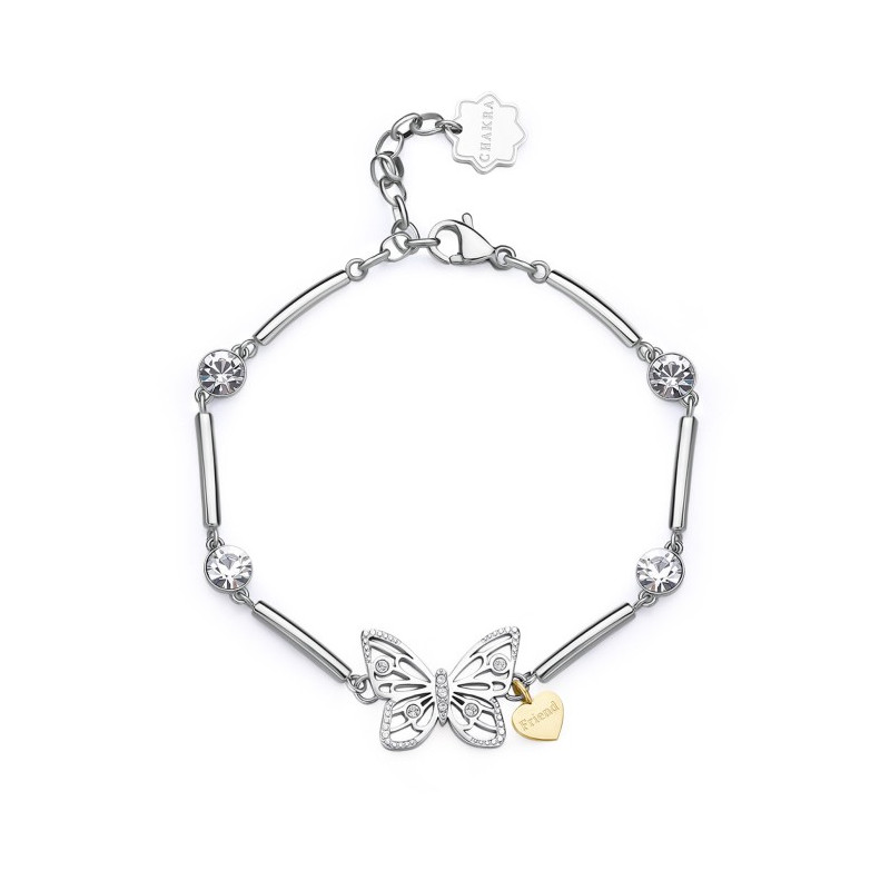 Descrizione: bracciale settori acciaio anallergico - cristalli bianchi - simbolo farfalla scritta amica - chiusura a moschettone - misura regolabile da 16 a 18 cm
