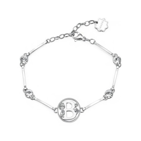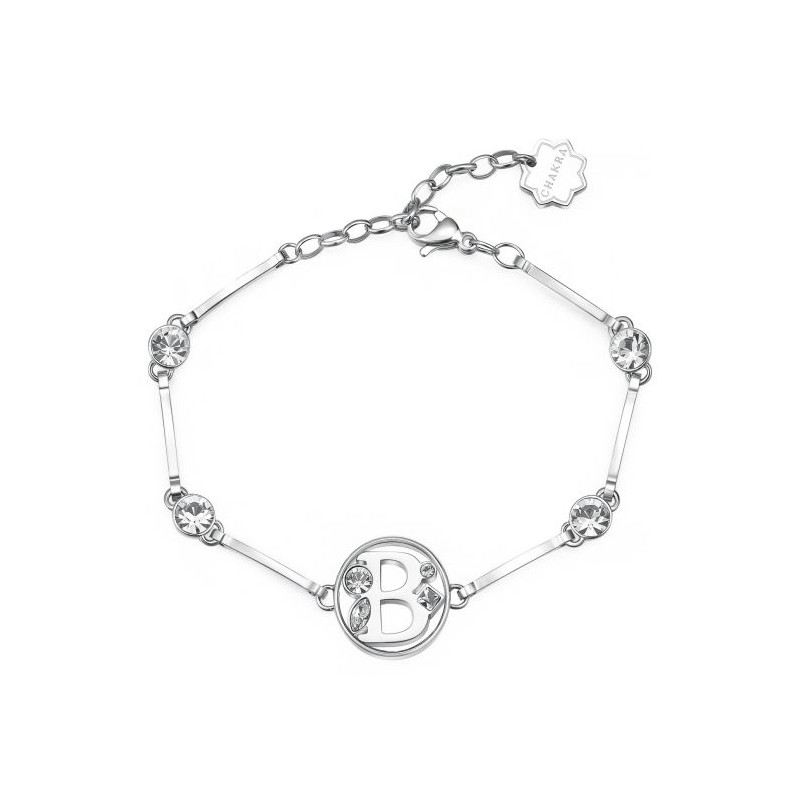Descrizione: bracciale a settori in acciaio anallergico - cristalli bianchi - simbolo lettera dell'alfabeto - chiusura a moschettone - misura regolable da 16 a 18 cm