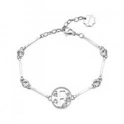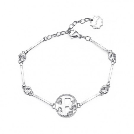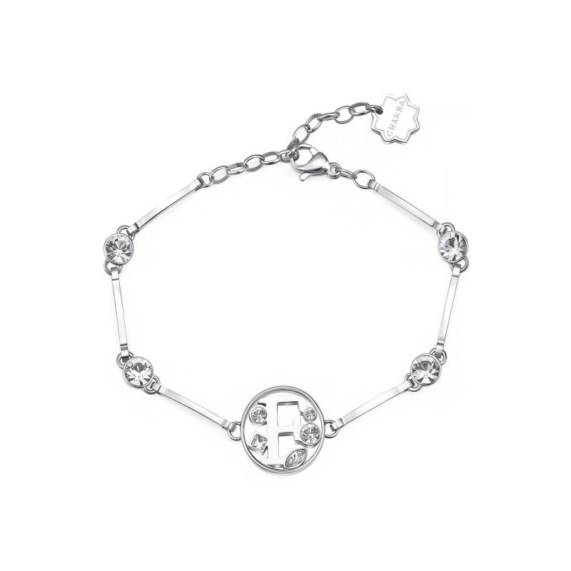 Descrizione: bracciale a settori in acciaio anallergico - cristalli bianchi - simbolo lettera dell'alfabeto - chiusura a moschettone - misura regolable da 16 a 18 cm