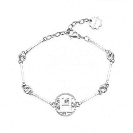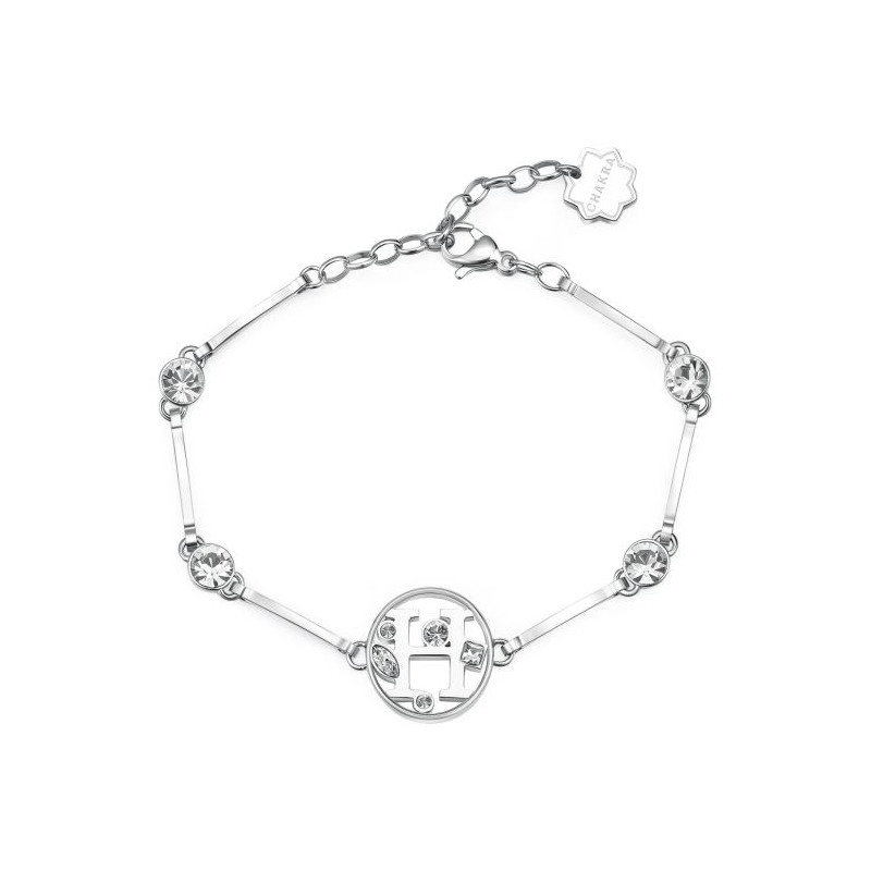 Descrizione: bracciale a settori in acciaio anallergico - cristalli bianchi - simbolo lettera dell'alfabeto - chiusura a moschettone - misura regolable da 16 a 18 cm