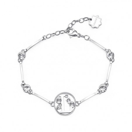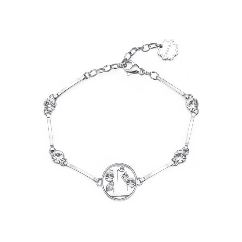 Descrizione: bracciale a settori in acciaio anallergico - cristalli bianchi - simbolo lettera dell'alfabeto - chiusura a moschettone - misura regolable da 16 a 18 cm